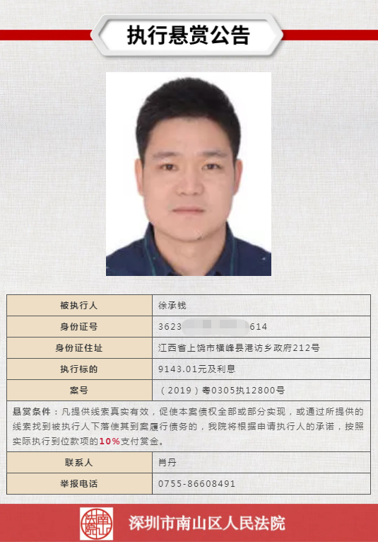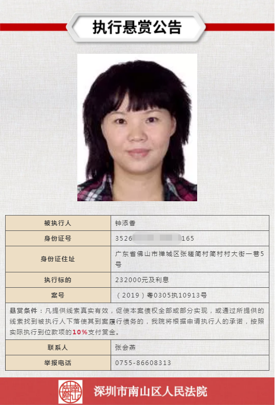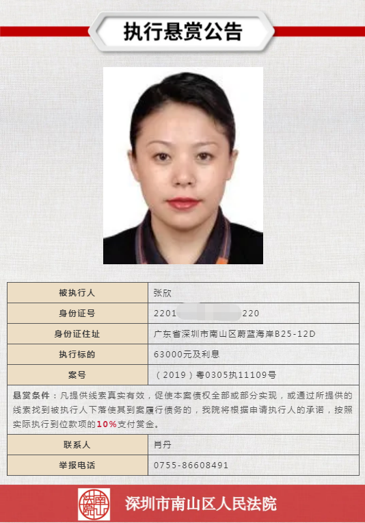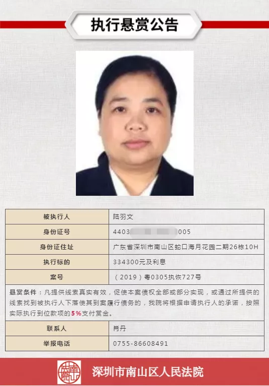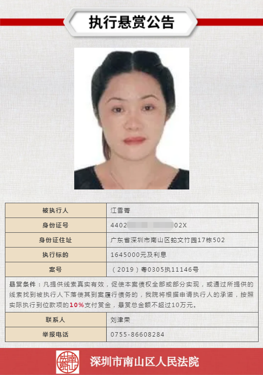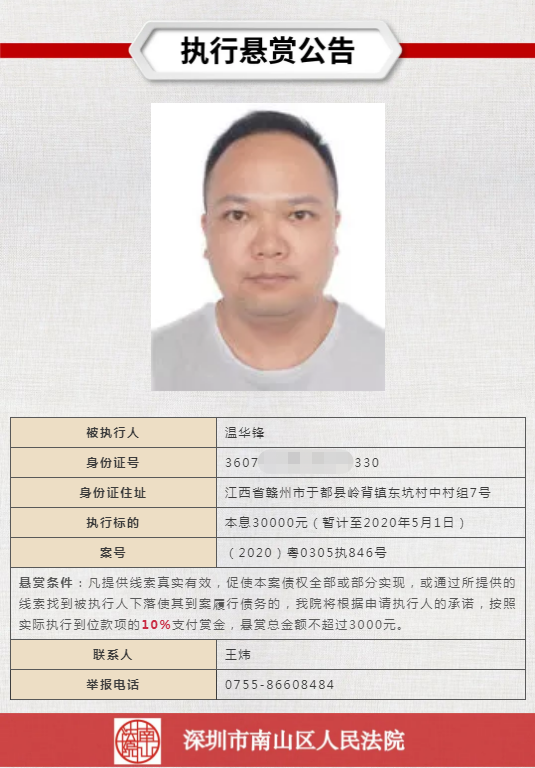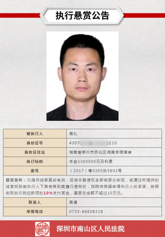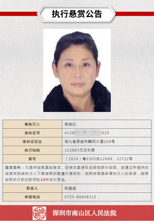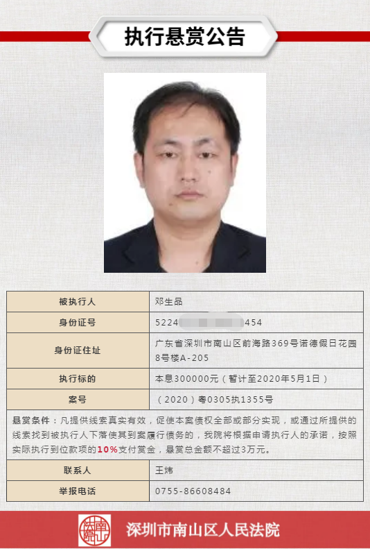 經(jīng)申請(qǐng)執(zhí)行人申請(qǐng),深圳市南山區(qū)人民法院向社會(huì)發(fā)布懸賞舉報(bào)公告,凡提供線索真實(shí)有效,促使本案?jìng)鶛?quán)全部或部分實(shí)現(xiàn),或通過(guò)所提供的線索找到被執(zhí)行人下落使其到案履行債務(wù)的,深圳市南山區(qū)人民法院將根據(jù)申請(qǐng)執(zhí)行人的承諾,按照實(shí)際執(zhí)行到位款項(xiàng)給予一定金額的賞金。