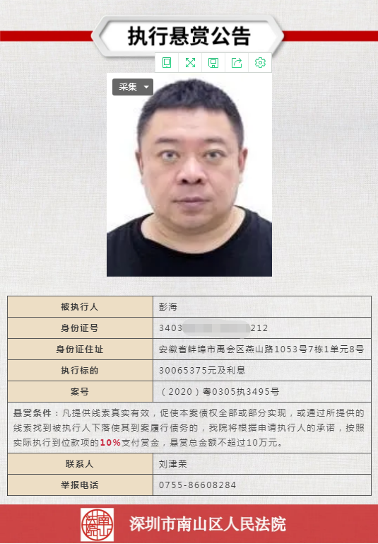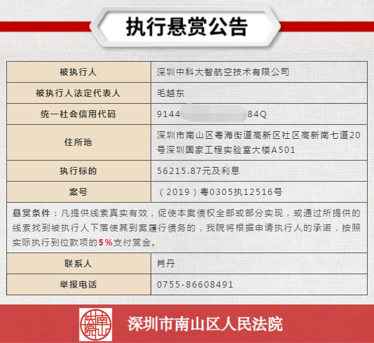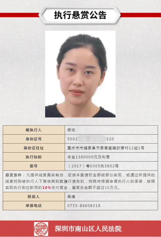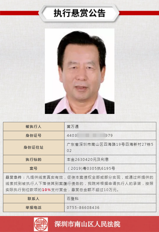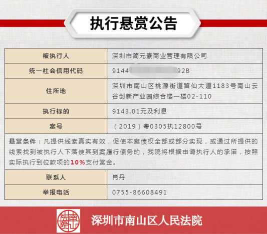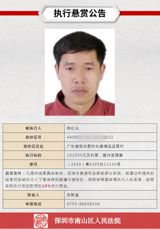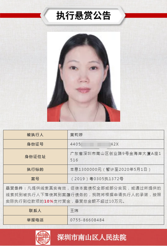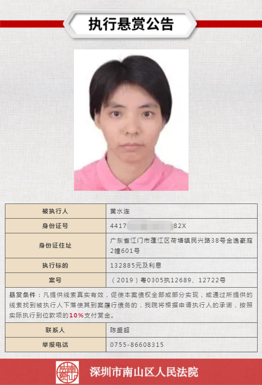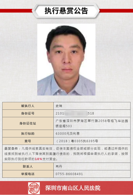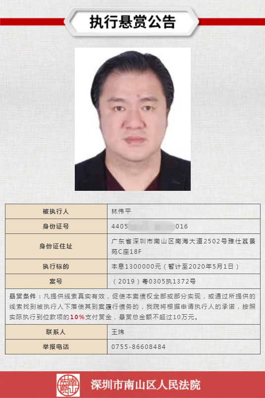經(jīng)申請(qǐng)執(zhí)行人申請(qǐng),深圳市南山區(qū)人民法院向社會(huì)發(fā)布懸賞舉報(bào)公告,凡提供線索真實(shí)有效,促使本案?jìng)鶛?quán)全部或部分實(shí)現(xiàn),或通過(guò)所提供的線索找到被執(zhí)行人下落使其到案履行債務(wù)的,深圳市南山區(qū)人民法院將根據(jù)申請(qǐng)執(zhí)行人的承諾,按照實(shí)際執(zhí)行到位款項(xiàng)給予一定金額的賞金。