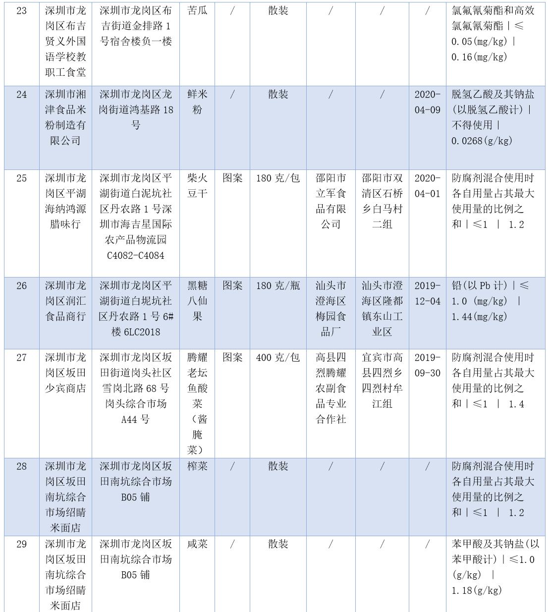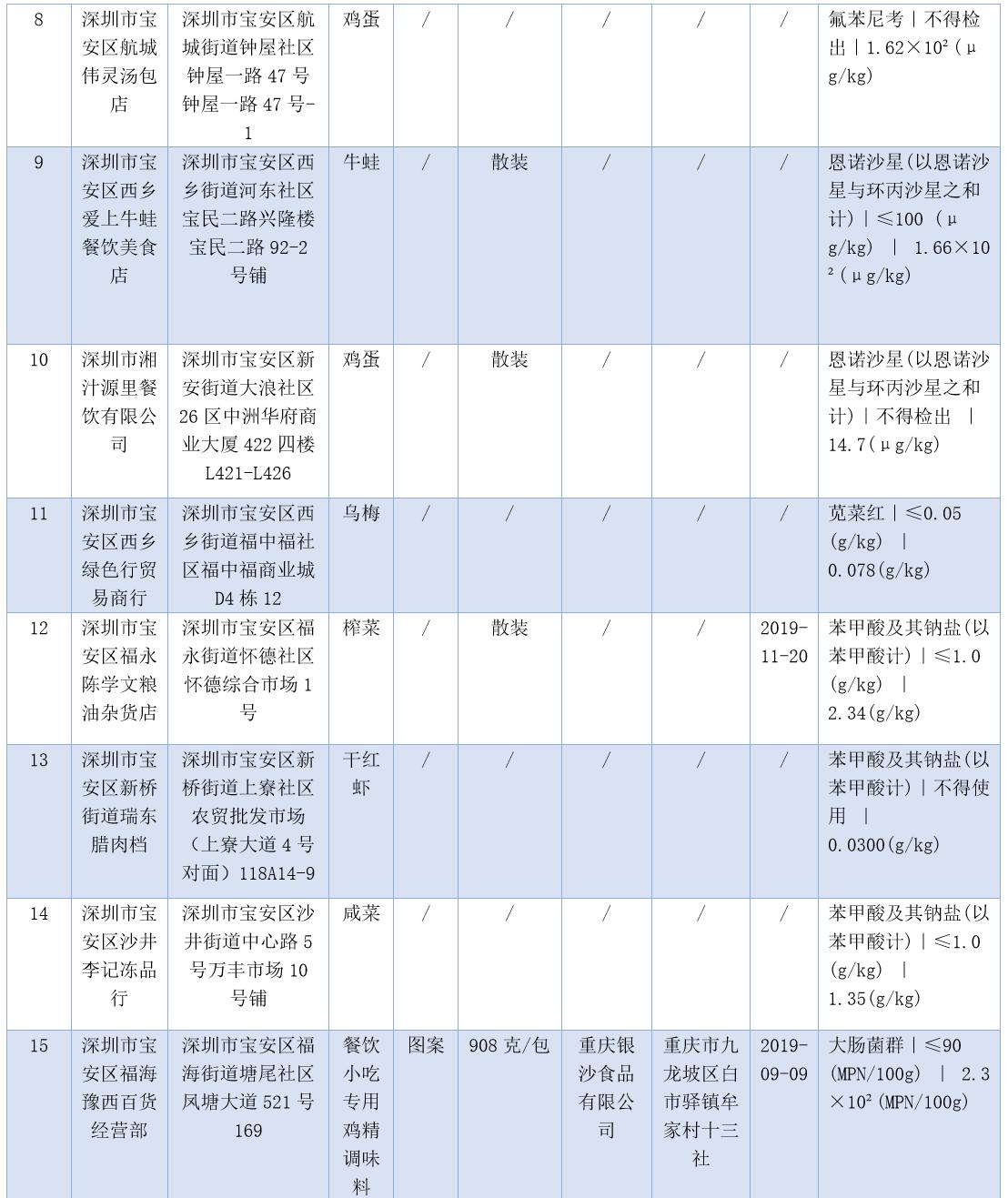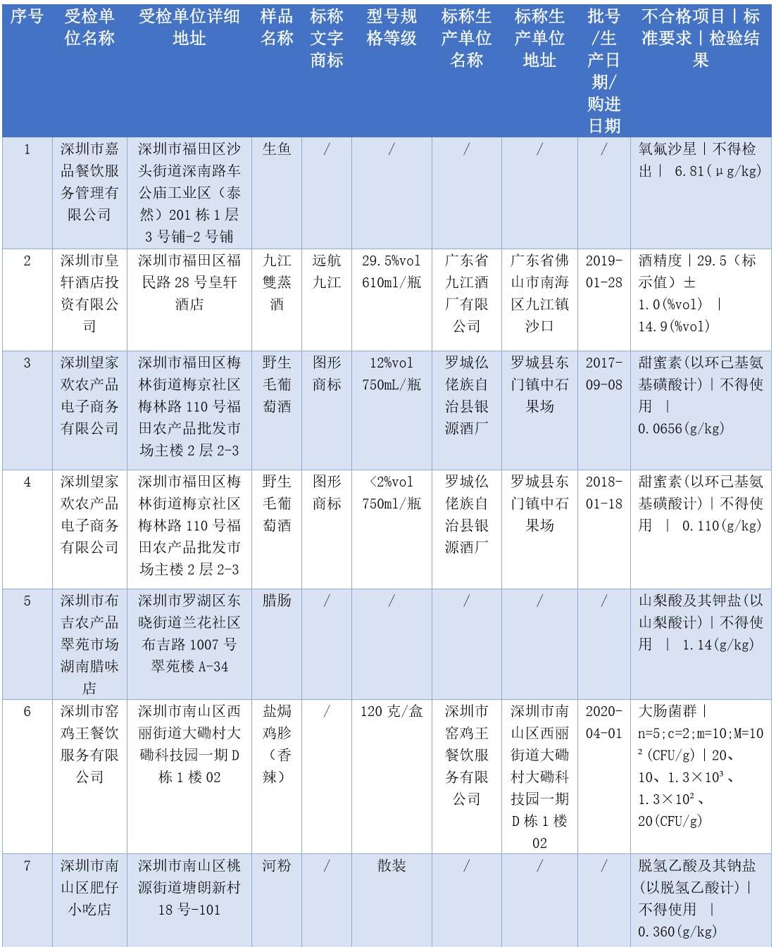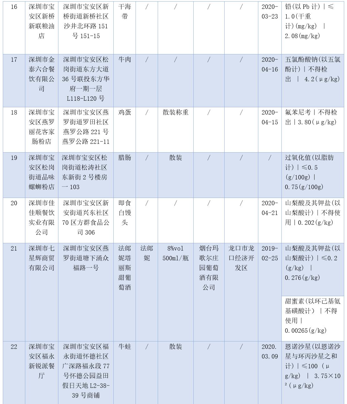 見圳客戶端·深圳新聞網(wǎng)2020年7月17日訊(晶報記者 鄧裴裴/制圖)7月17日,深圳市市場監(jiān)督管理局官網(wǎng)發(fā)布了2020年第二十二期食品安全抽樣檢驗情況通報,3-5月,共抽檢生產(chǎn)、流通、餐飲環(huán)節(jié)食品1229批次,發(fā)現(xiàn)不合格樣品47批次。記者注意到,不少不合格樣品抽檢單位為餐飲店,包括皇軒酒店、窯雞王、愛上牛蛙、御可奶茶等,還有些小吃店、腸粉店、螺獅粉店紛紛上榜。涉及不合格項目類別包括農(nóng)藥殘留、獸藥殘留、食品添加劑、微生物污染、品質(zhì)指標、金屬等元素污染物。