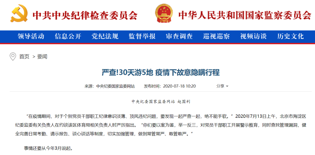 “疫情期間多次離京出國,回京后不向單位、社區(qū)報(bào)告,也不居家隔離……”2020年3月,正值全國上下防控新冠肺炎疫情的關(guān)鍵時(shí)期,北京市海淀區(qū)紀(jì)委監(jiān)委收到一條舉報(bào)線索,被舉報(bào)對(duì)象是海淀區(qū)體育局綜合管理服務(wù)中心工作人員駱某。