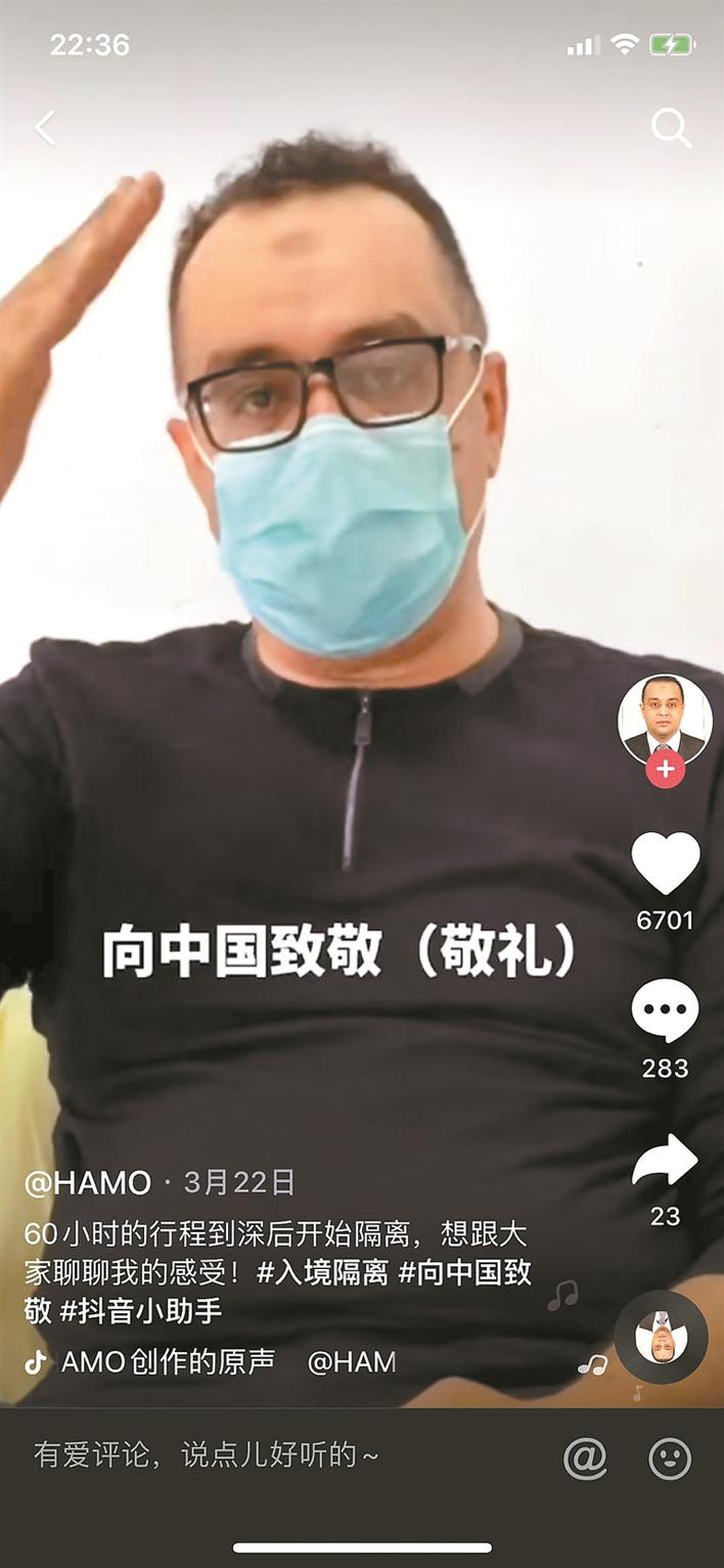 而在另一邊,方哈默也自愿當起了中國防疫宣傳大使,他用短視頻在抖音記錄了中國抗疫暖心舉措,向國內外宣傳羅湖各項防疫措施,截至目前,他在抖音已收獲了2.4萬的點贊量。網友們紛紛留下了暖心的鼓勵“謝謝你的理解”“歡迎你來到中國”?!拔蚁壬莻€比較開朗的人,也很喜歡中國的生活環(huán)境,喜歡中國人,我們周圍的鄰居、朋友對我們很好,沒有因為現(xiàn)在的疫情就歧視外國人或不敢靠近。所以他的心態(tài)一直都不錯?!狈焦奶嬖V記者,其實,對于她的丈夫來說,中國已經是他的第二個家鄉(xiāng)。在疫情發(fā)生以來,他一直孜孜不倦地向所有朋友分享著中國政府在此次疫情中所做的努力和貢獻。