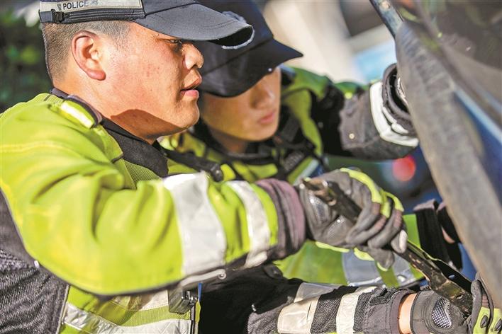 時(shí)云財(cái)和同事馬上幫助陳先生從車后備箱拿出換胎工具和備胎,在保證安全的前提下,僅用10分鐘就更換好輪胎?!疤兄x你們了,深圳交警‘小黃人’真的是我們最信任的人,有你們?cè)谖矣X得上路開車就很放心?!标愊壬蛔〉馗兄x、稱贊交警鐵騎小哥。