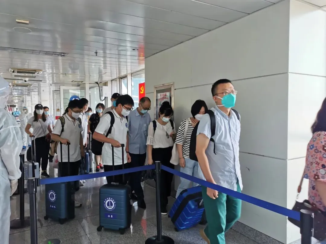 △來自武漢的核酸檢測人員抵達(dá)新疆烏魯木齊地窩堡國際機(jī)場。