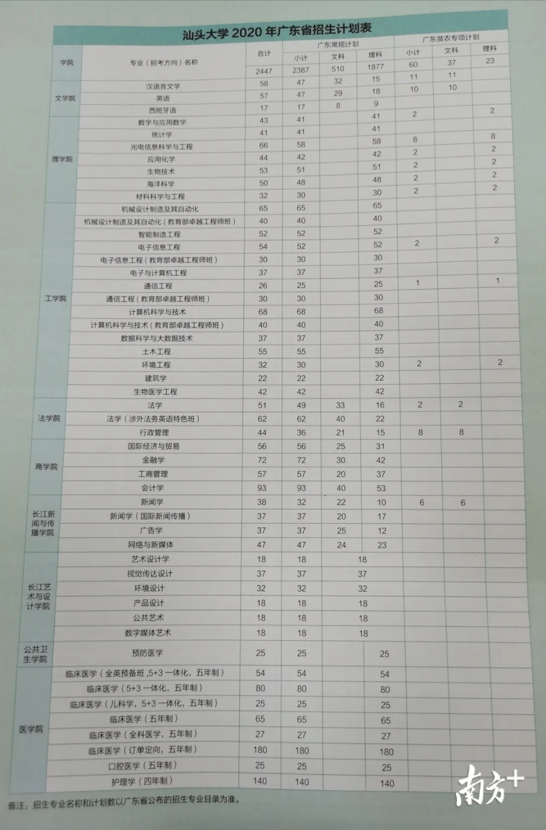 汕大本科生招生計(jì)劃數(shù)為3100人,新增預(yù)防醫(yī)學(xué)、藥學(xué)專業(yè),分別招生30人、20人,并增加新聞學(xué)專業(yè),新增國(guó)際新聞傳播方向,招生45人。
