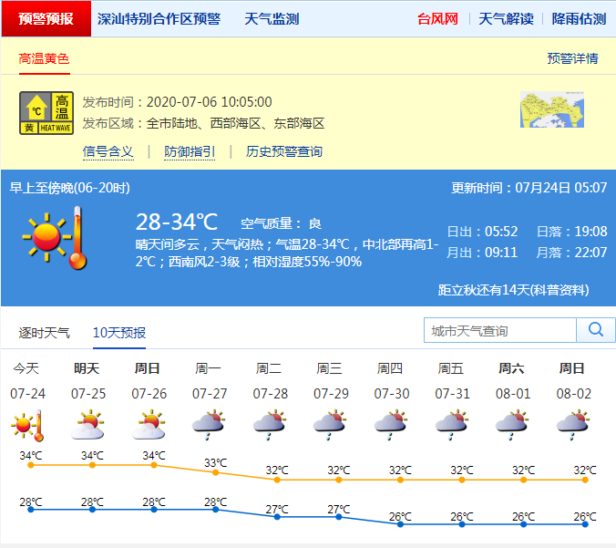 見(jiàn)圳客戶端·深圳新聞網(wǎng)2020年7月24日訊(見(jiàn)圳客戶端、深圳新聞網(wǎng)記者 陳婕 鄭曉鵬)老天熱“晴”不斷,今明兩天悶熱加劇。24日晴天間多云,天氣悶熱;氣溫28-34℃,中北部再高1-2℃;偏南風(fēng)3級(jí);濕度55%-90%。25日晴天間多云,最高氣溫34-35℃,中北部可達(dá)36-37℃。26日持續(xù)晴熱,局地有短時(shí)(雷)陣雨;27-29日多云,有短時(shí)(雷)陣雨;30日有陣雨或雷陣雨。