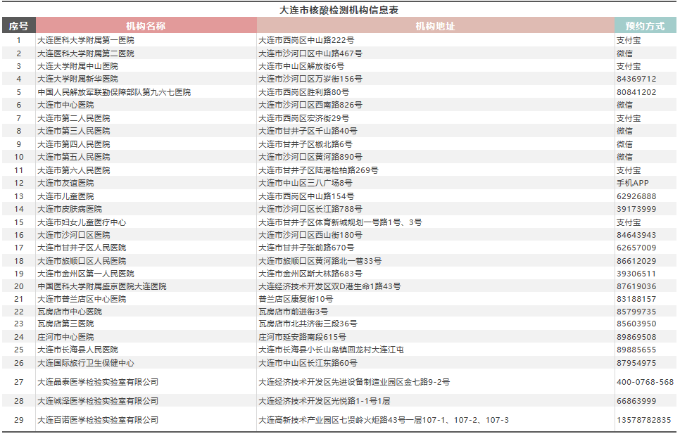 7月24日起,大連市人員原則上實施非必要不離連,確需離連的,須持7日內核酸檢測陰性證明;冷藏冷凍肉品、海產品企業(yè)或場所從業(yè)人員盡快實施核酸檢測。大連市對外核酸檢測機構現(xiàn)有29家,機構地址和預約方式,市民可登錄大連市衛(wèi)生健康委官方網站進行查詢。