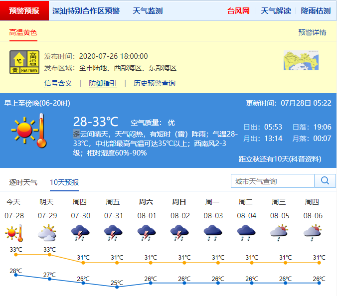 見圳客戶端?深圳新聞網2020年7月28日訊 根據深圳氣象局官方消息,7月28日白天多云間晴天,天氣悶熱,有短時(雷)陣雨;氣溫28-33℃,中北部最高氣溫可達35℃以上;西南風2-3級;相對濕度60%-90%。