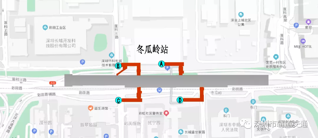 冬瓜嶺站地處福田區(qū)天威視訊附近,車站沿規(guī)劃福田彩田路南北向布置,車站為地下二層一島一側式站臺鋼筋混凝土箱形框架結構。車站共設出入口7個:A、B、C、D、3個物業(yè)出入口(E、F、G口)。