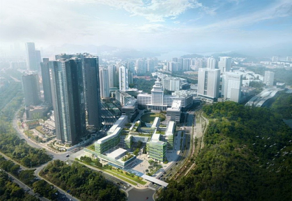 在設(shè)計上,項目采用符合嶺南氣候特點、體現(xiàn)現(xiàn)代建筑美學(xué)的設(shè)計語言,兼顧與哈爾濱工業(yè)大學(xué)(深圳)本科校區(qū)的協(xié)調(diào)性,同時嫁接原有建筑風(fēng)格元素。項目延續(xù)了本科生教學(xué)區(qū)的中軸線,再向南連接到留仙大道,在軸線收尾處布置展覽中心形成對景并實現(xiàn)軸線的轉(zhuǎn)折。