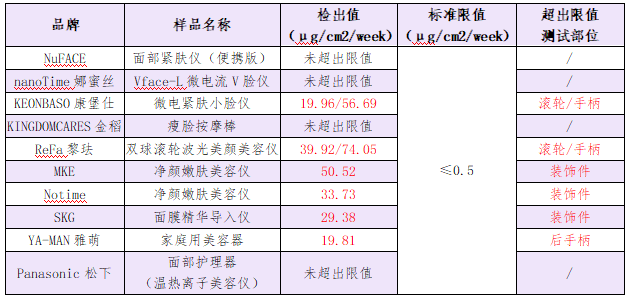 值得注意的是,在測試的10款家用美容儀樣品中6款樣品鎳釋放量測試結(jié)果不符合歐盟REACH法規(guī)要,包括KEONBASO康堡仕微電緊膚小臉儀、ReFa黎琺雙球滾輪波光美顏美容儀、MKE凈顏嫩膚美容儀、Notime凈顏嫩膚美容儀、SKG面膜精華導(dǎo)入儀、YA-MAN雅萌家庭用美容器。