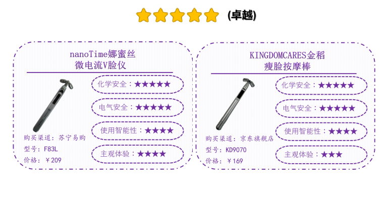 經(jīng)測試,綜合化學(xué)安全、電氣安全、使用智能性、主觀體驗等消費(fèi)者關(guān)心的多個維度,2款微電流型家用美容儀和1款電離子型美容儀品質(zhì)領(lǐng)跑表現(xiàn)卓越,分別為,國產(chǎn)品牌nanoTime娜蜜絲F83L微電流V臉儀和KINGDOMCARES金稻 KD9070瘦臉按摩棒;日本品牌Panasonic松下 EH-ST50面部護(hù)理器(溫?zé)犭x子美容儀)。
