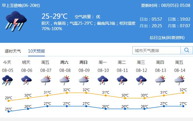 見圳客戶端·深圳新聞網(wǎng)2020年8月5日訊 今日我市陰天,有暴雨;氣溫25-29℃;偏南風(fēng)3級(jí);相對(duì)濕度70%-100%。深圳市氣象臺(tái)于2020年8月5日5時(shí)15分在全市發(fā)布雷電預(yù)警,今天上午海上將不斷有降雨云團(tuán)生成,受其影響我市有零散雷暴;未來6小時(shí)累計(jì)雨量將達(dá)暴雨,深圳市氣象臺(tái)于2020年8月5日5時(shí)40分在全市發(fā)布暴雨黃色預(yù)警,全市進(jìn)入暴雨戒備狀態(tài),需注意防范。市民停留在安全地方;按照防御預(yù)案停止戶外易燃易爆危險(xiǎn)作業(yè),并加強(qiáng)?;瘓?chǎng)所安全管理。