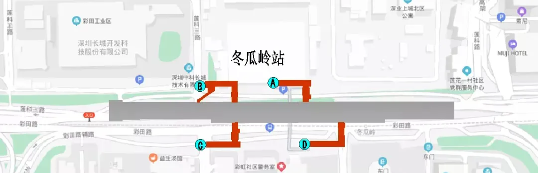 冬瓜嶺站地處福田區(qū)天威視訊附近,車站沿規(guī)劃福田彩田路南北向布置,車站為地下二層一島一側(cè)式站臺(tái)鋼筋混凝土箱形框架結(jié)構(gòu)。車站共設(shè)出入口7個(gè):A、B、C、D、3個(gè)物業(yè)出入口(E、F、G口)。