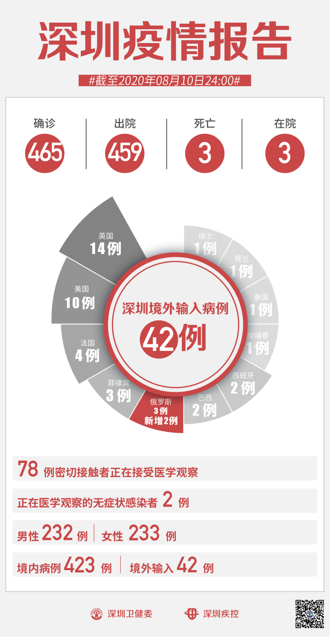 截至8月10日24時,深圳市累計報告新冠肺炎確診病例465例。目前在院3例。