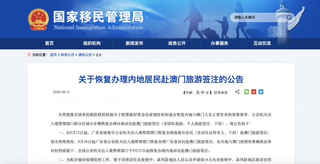 國(guó)家移民管理局官網(wǎng)8月11日消息,為貫徹落實(shí)國(guó)務(wù)院聯(lián)防聯(lián)控機(jī)制關(guān)于統(tǒng)籌做好常態(tài)化疫情防控和逐步恢復(fù)內(nèi)地與澳門(mén)人員正常往來(lái)的部署要求,公安機(jī)關(guān)出入境管理部門(mén)將分區(qū)域分步驟恢復(fù)辦理內(nèi)地居民赴澳門(mén)旅游簽注(含團(tuán)隊(duì)旅游、個(gè)人旅游簽注,下同)。