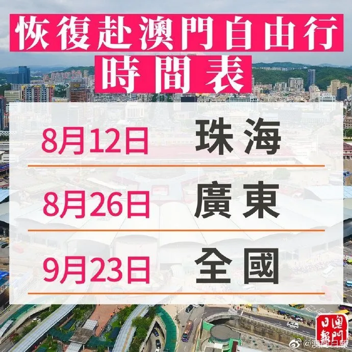 一、自8月12日起,廣東省珠海市公安機(jī)關(guān)出入境管理部門(mén)恢復(fù)辦理珠海市居民(含居住證持有人,下同)赴澳門(mén)旅游簽注;如無(wú)特殊情況,8月26日起,廣東省公安機(jī)關(guān)出入境管理部門(mén)恢復(fù)辦理廣東省居民赴澳門(mén)旅游簽注;在內(nèi)地與澳門(mén)疫情形勢(shì)繼續(xù)總體向好的前提下,全國(guó)公安機(jī)關(guān)出入境管理部門(mén)于9月23日起恢復(fù)辦理內(nèi)地居民赴澳門(mén)旅游簽注。