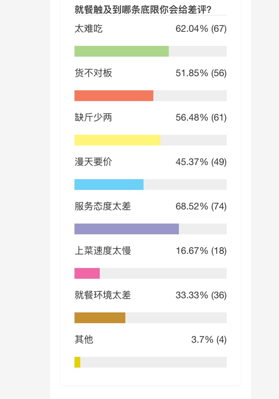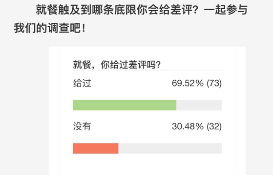 用餐后做出評價(jià),是消費(fèi)者的基本權(quán)利。針對“就餐差評”的問題,深圳新聞網(wǎng)昨天發(fā)起了網(wǎng)友投票。結(jié)果,有69.52%的網(wǎng)友表示,他們曾經(jīng)在用餐后給過差評。在給出差評的原因中,“服務(wù)態(tài)度差”、“太難吃”高居前兩名。對商家提出中肯的批評與監(jiān)督,是每個(gè)消費(fèi)者享有的基本權(quán)利,中肯的評價(jià)不僅是商家進(jìn)步的動力,也讓更多網(wǎng)友能夠快速篩選定位商家,從而促進(jìn)行業(yè)的良性發(fā)展。