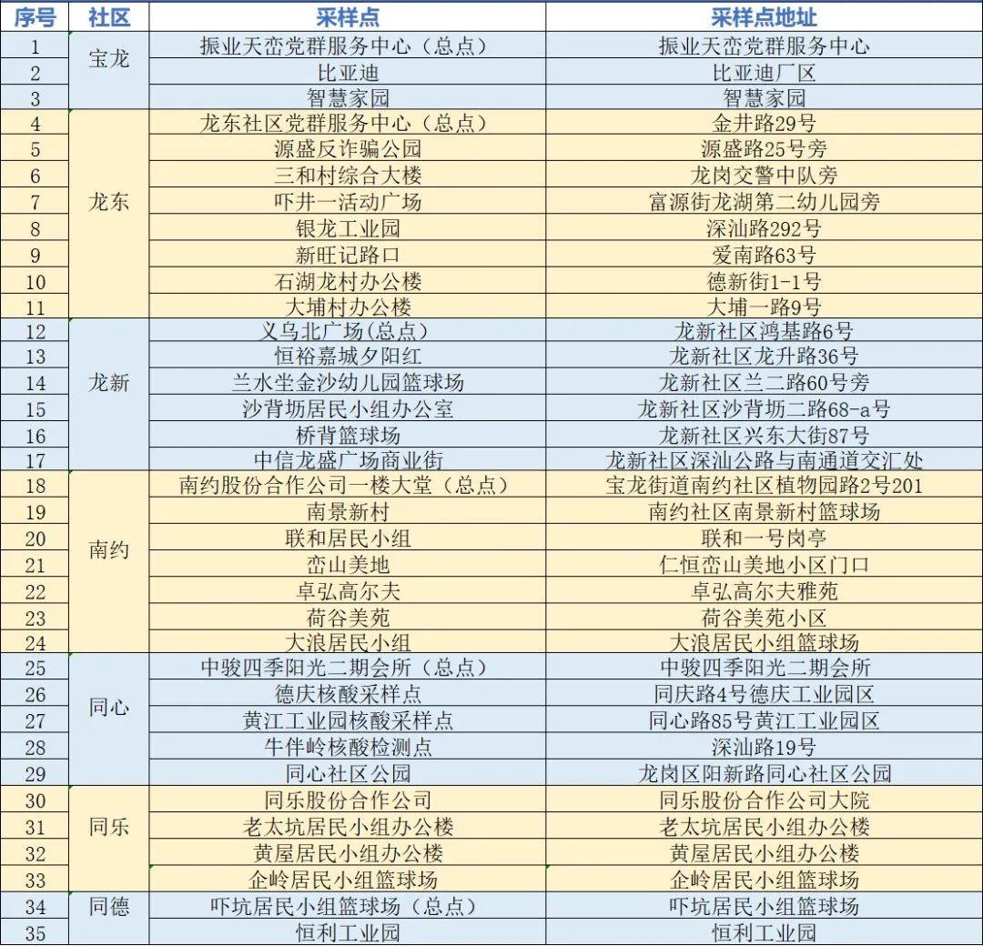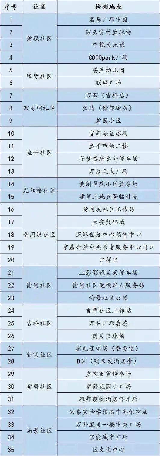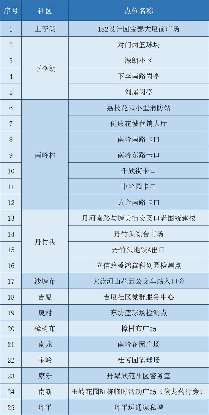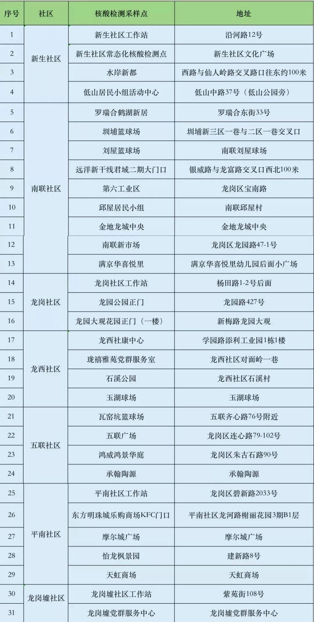 根據(jù)疫情防控需要,為最大程度保障人民群眾生命安全和身體健康,龍崗區(qū)各街道于1月10日開展新一輪免費核酸檢測以下點位統(tǒng)計截至1月10日。各點位動態(tài)更新請以社區(qū)通知及現(xiàn)場實際情況為準(zhǔn)。