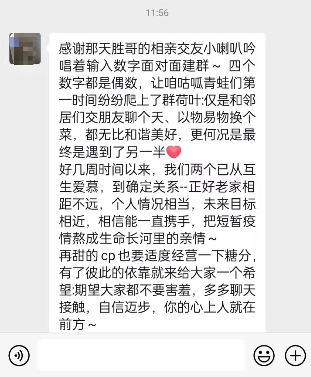 一開(kāi)始單身交友群只有一個(gè),慢慢地周邊社區(qū)越來(lái)越多人加入,群聊數(shù)量增加到了十個(gè)。由于群信息互不相通,王勝在每天做完工作后,轉(zhuǎn)發(fā)各單身青年的個(gè)人介紹、照片以及擇偶標(biāo)準(zhǔn)到十個(gè)群里,有時(shí)發(fā)成語(yǔ)接龍的小游戲活躍氣氛?!叭豪锏膯紊砬嗄陚兎浅7e極,大家都喜歡這種模式。我沒(méi)事的時(shí)候也經(jīng)常和他們聊聊天,讓大家隔離期間。”王勝說(shuō)。