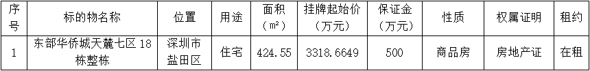 深圳報(bào)業(yè)集團(tuán)委托深圳聯(lián)合產(chǎn)權(quán)交易所對(duì)深圳市鹽田區(qū)東部華僑城天麓七區(qū)18棟整棟房產(chǎn)進(jìn)行公開掛牌交易,深圳聯(lián)合產(chǎn)權(quán)交易所現(xiàn)已公開披露以下產(chǎn)權(quán)轉(zhuǎn)讓信息,廣泛征集受讓方。請(qǐng)有意者到深圳聯(lián)合產(chǎn)權(quán)交易所辦理受讓登記手續(xù)。