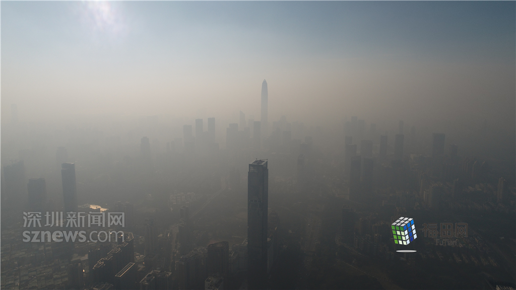 1月18日上午,記者操控無人機俯瞰深圳中心區(qū)發(fā)現(xiàn),灰霾將天空“割裂”成一道涇渭分明的界線,把城市籠罩得如同一個充滿霧靄的森林。從平安金融大廈的上空遠眺,西南面的深圳灣在灰霾的籠罩下變成了一片“沙漠”,東面的京基一百幾乎被灰霾“吞沒”,北邊平時肉眼可看的梅林山也因為能見度較低變得若隱若現(xiàn),南面的米埔濕地也被云遮霧繞。