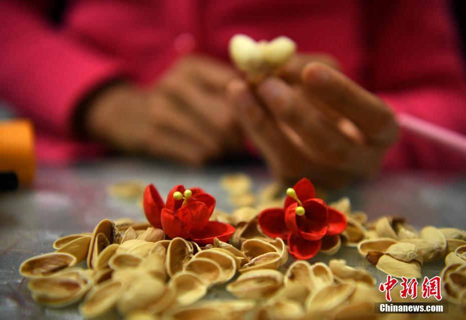 四川樂山29歲的陳艷因“先天性脆骨癥”被稱為“瓷娃娃”,下肢無(wú)力支撐正常行走,其在愛心人士的鼓勵(lì)和幫助下,用不懈的毅力、勤奮和靈巧的雙手,在逆境中快樂堅(jiān)強(qiáng)生活。圖為3月1日,陳艷用開心果制作裝飾品“梅花”。