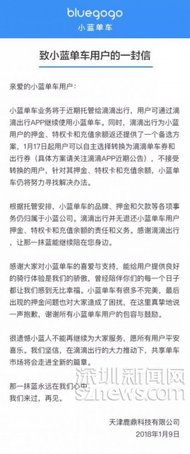 圖為小藍單車發(fā)表的聲明(資料圖片)