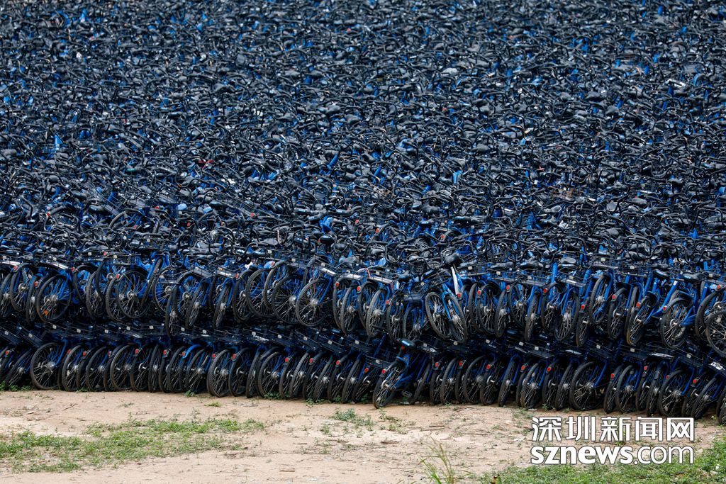大量的小藍(lán)單車堆放在龍崗區(qū)水官高速旁的空地