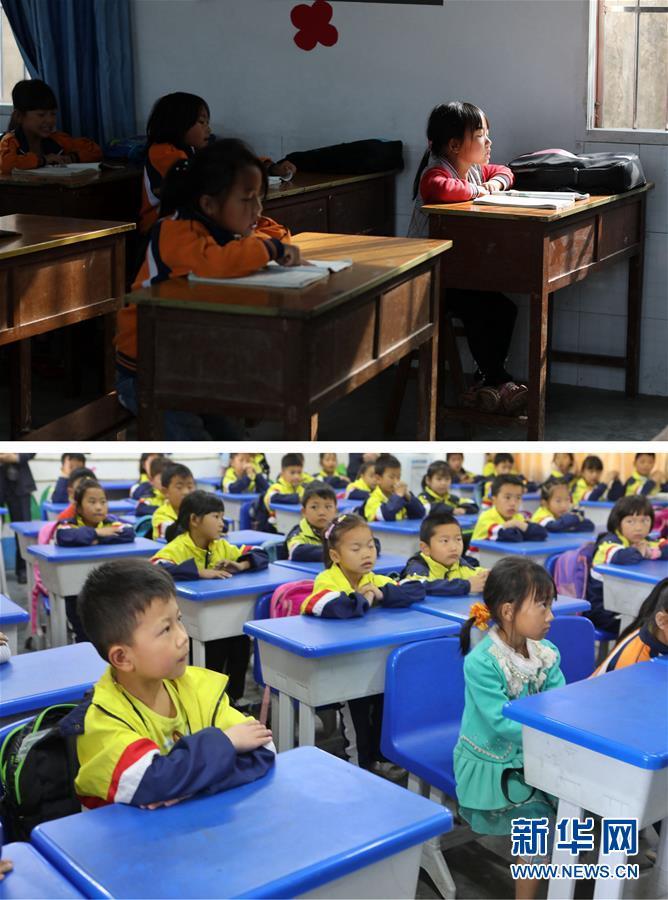 拼版照片:上圖為7歲的李曉彤(右一)在華山小學(xué)教室內(nèi)晨讀(4月27日攝);下圖為7歲的李曉彤(前排左二)在黔西縣第十小學(xué)教室內(nèi)上課(5月7日攝)。貴州省黔西縣金蘭鎮(zhèn)瓦房村哈沖組位于六沖河岸邊的崖壁下,哈沖組的孩子們每天要往返崖壁上的山路才能到達華山小學(xué)就讀。28年來,崖壁上約4公里山路成了當(dāng)?shù)孛缱鍖W(xué)生艱難危險的求學(xué)路。 5月5日起,哈沖組里的苗族同胞陸續(xù)通過易地扶貧搬遷至縣城的錦繡花都安置點,孩子們也陸續(xù)搬至黔西縣第十小學(xué)就讀。自此,孩子們的上學(xué)路從約2個小時艱難跋涉的崖壁山路變?yōu)椴叫兄恍枰胄r的公路。求學(xué)之路“天塹變通途”,哈沖組村民幾代人的崖壁求學(xué)路成為歷史。新華社記者歐東衢攝