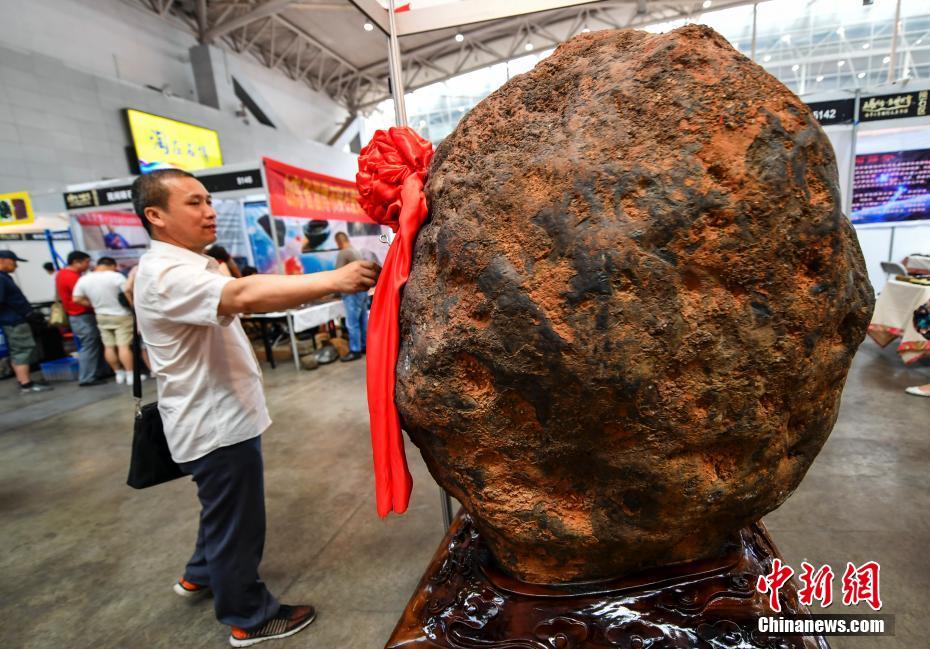 6月15日,第十一屆新疆觀賞石、和田玉精品博覽會在新疆烏魯木齊開幕,本次博覽會參展種類涵蓋珠寶、玉石、礦石、隕石、觀賞石等,吸引眾多奇石玩家到場“以石會友”,打造獨具特色的“品石”盛宴。圖為一塊重達(dá)3.5噸的鐵隕石,任何鐵制品一旦靠近便被吸附。中新社記者劉新 攝