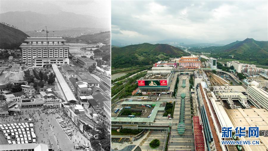 拼版照片:左圖為當(dāng)年深圳新建的聯(lián)檢大樓(資料照片,新華社記者盧炳輝攝);右圖為2018年6月12日無(wú)人機(jī)拍攝的羅湖口岸聯(lián)檢大樓片區(qū)(新華社記者毛思倩攝)。