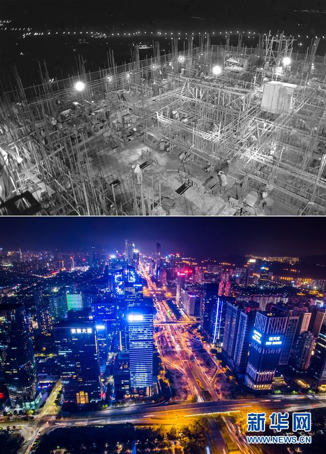 拼版照片:上圖為建筑工人在深圳國際貿(mào)易中心大廈工地工作(資料照片,新華社記者陳學思攝);下圖為2017年2月14日無人機拍攝的深圳夜景(新華社記者毛思倩攝)。新華社發(fā)