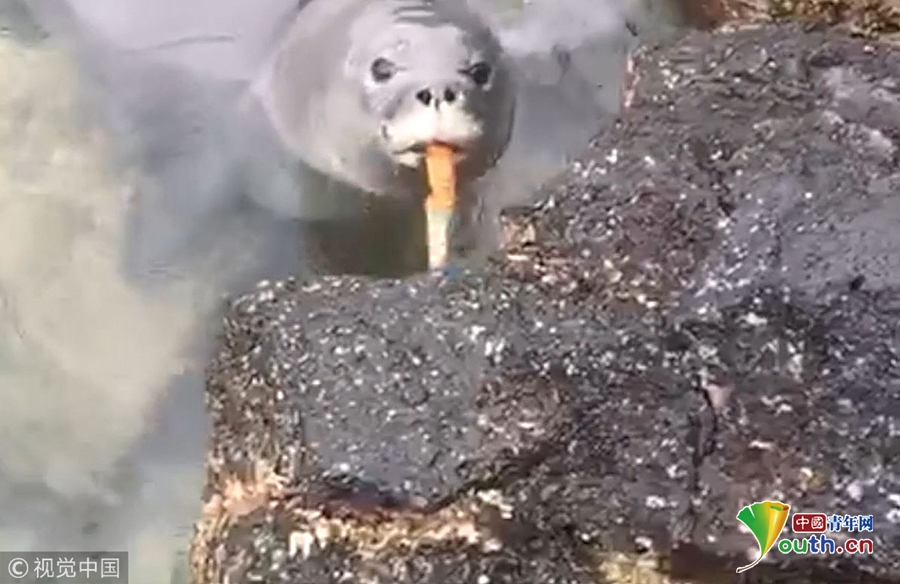 當(dāng)?shù)貢r間2018年4月15日,美國夏威夷,一位保護(hù)區(qū)管理員發(fā)現(xiàn)一只小僧海豹銜著一把廢棄匕首的刀柄。這只小僧海豹剛斷奶,海洋哺乳動物中心和自然資源部的工作人員一直都在關(guān)注它。