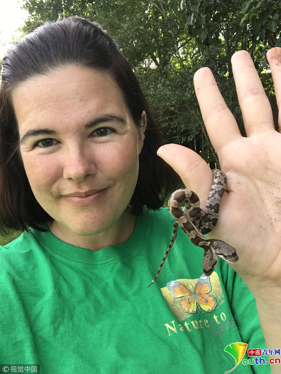 野生動物專家Tanee Janusz收養(yǎng)了同事在后院發(fā)現的一只雙頭錦蛇。圖片來源:視覺中國