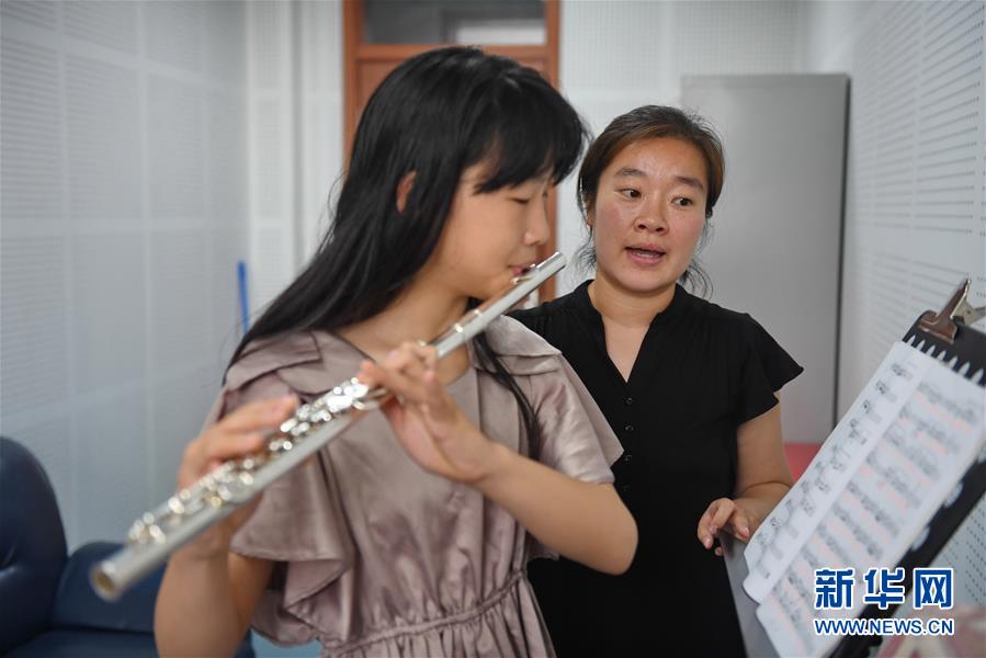 7月16日,在長春市少年宮,教師張佳(右)給學(xué)生上長笛課。