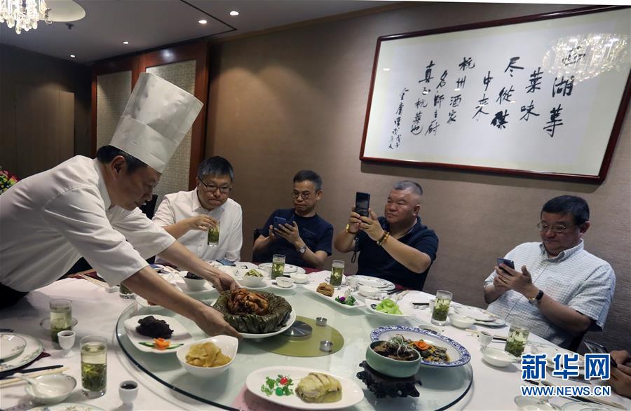 杭州酒家老板吳瑞康為客人端上自己親自制作的“叫化雞”(6月16日攝)。 金庸在武俠小說《神雕俠侶》中借郭靖之口說過: “為國(guó)為民,俠之大者?!蔽鋫b精神在香港備受推崇,有其心向中華文化的情感基礎(chǔ)。在這個(gè)國(guó)際美食之都,品味舌尖上的武俠味,內(nèi)中的感覺別有深意。新華社記者 李鵬 攝
