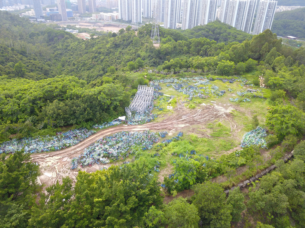 7月27日下午,深圳新聞網(wǎng)記者前往安托山公園現(xiàn)場航拍。從無人機鏡頭里,記者的確在安托山公園山頂發(fā)現(xiàn)了大量共享單車,這些單車被無序堆放在山頂?shù)囊黄盏厣希渲锌狎T、小藍單車居多,此外還有少量摩拜、小黃等仍在運營的共享單車品牌的車輛,總數(shù)量估算有上千輛。