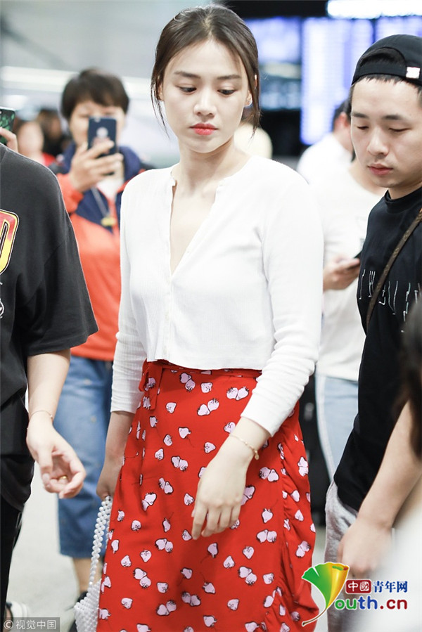 2018年7月31日,“水月”馬思純從北京飛往上海現(xiàn)身機(jī)場,她身穿草莓圖案大紅裙,手提櫻桃小竹籃,造型清新甜美,搭配深V白襯衫,美胸若隱若現(xiàn),平添小性感。