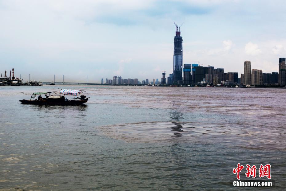 7月14日,一艘漁船停在長(zhǎng)江和漢江交匯處,從漢陽南岸嘴望去漢江(左)與長(zhǎng)江(右)“涇渭分明”。中新社記者 張暢 攝