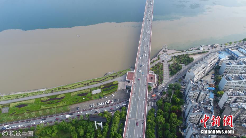 5月7日,湖北省襄陽市,無人機(jī)航拍的漢江長(zhǎng)虹大橋處涇渭分明的漢江水面。強(qiáng)暴雨沖刷經(jīng)過去冬今春的田野地表積累的塵土,經(jīng)支流與主河道匯入時(shí),充滿污泥的洪水與主河道上清澈的丹江水形成難得一見的涇渭分明景觀。王虎攝 圖片來源:視覺中國(guó)