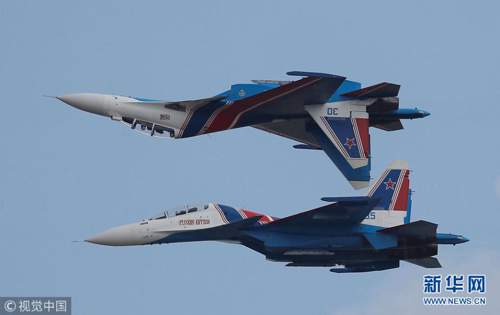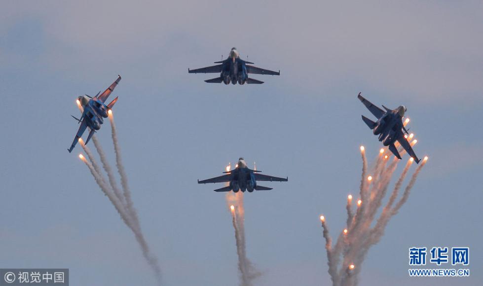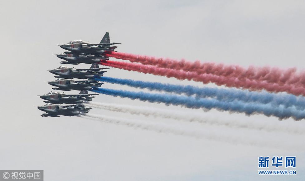 當地時間2018年8月4日,俄羅斯梁贊,2018“航空飛鏢”國際軍事比賽即將開幕,特技飛行隊在彩排。(圖片來源:視覺中國)