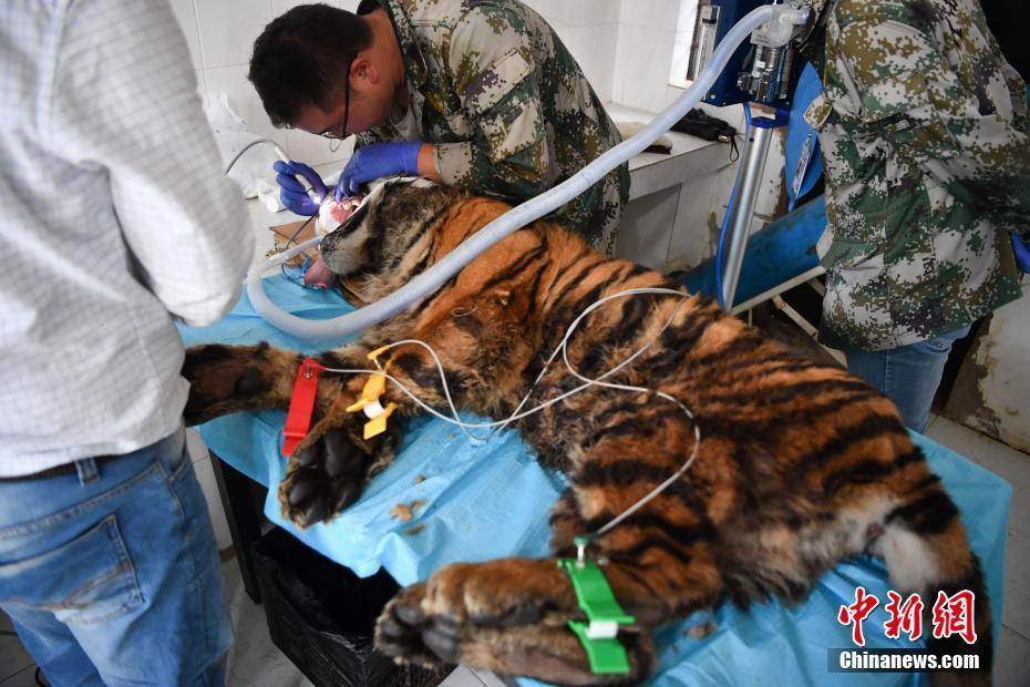 8月9日,位于昆明的云南野生動(dòng)物園獸醫(yī)通過呼吸麻醉的方式,為園中一只一歲的老虎清潔牙。 中新社記者 劉冉陽 攝