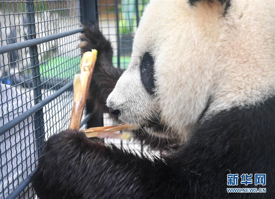 8月20日,大熊貓“夢(mèng)夢(mèng)”在吃竹筍。 新華社記者 許暢 攝