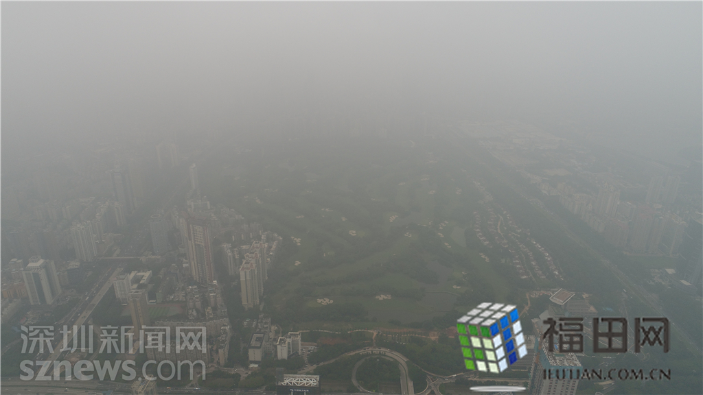 從平安大廈頂樓往下看,深圳高爾夫球場的綠地和湖泊已經(jīng)分辨不清了,能見度降到1公里。