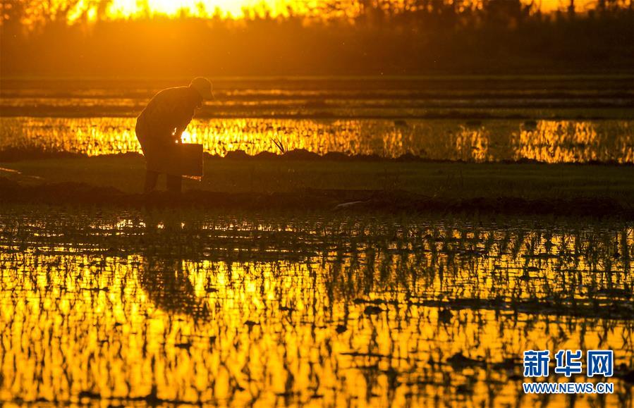 夕陽西下,村民在新疆察布查爾錫伯自治縣種羊場托海依村的一處農(nóng)田里勞動(5月21日攝)。近日,隨著氣溫漸高,地處新疆伊犁河谷的察布查爾錫伯自治縣迎來插秧高峰期,田間地頭一派繁忙景象。塊塊稻田水滿如鏡,田間防護(hù)林枝繁葉茂,遠(yuǎn)處雪山依稀可見,如一幅在大地上鋪展開的生態(tài)畫卷。新華社記者胡虎虎 攝