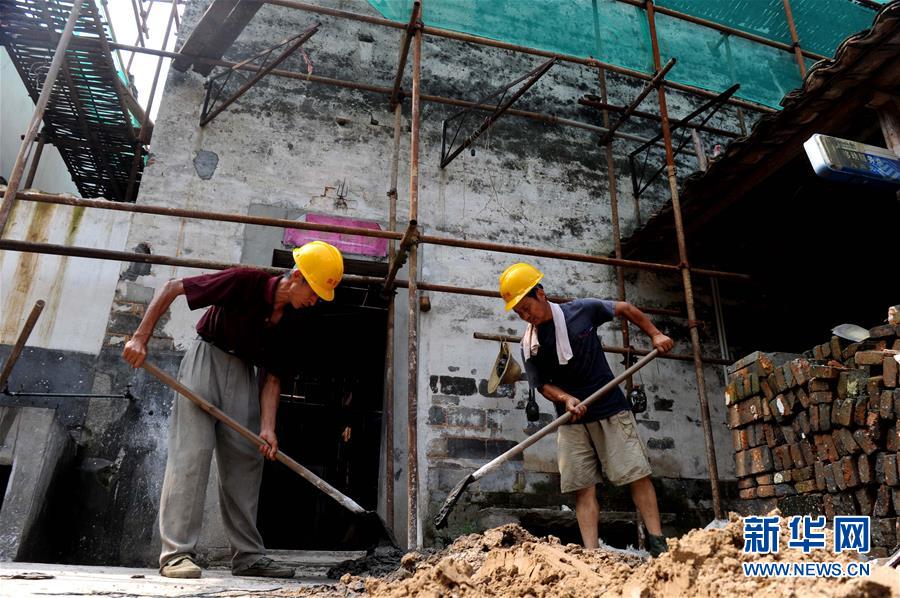 工人在對安徽涇縣黃田古村落一處古民居進行修復(fù)施工(2014年7月10日攝)。