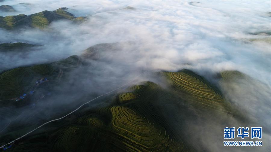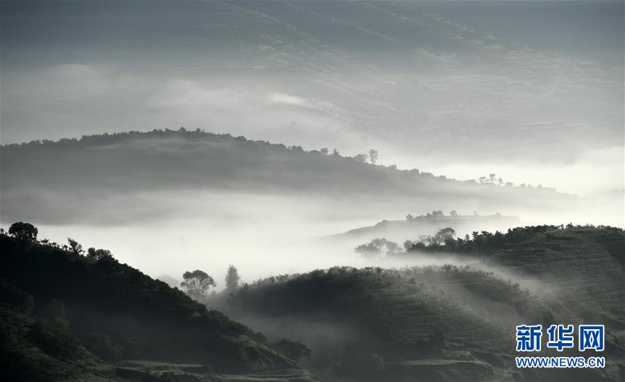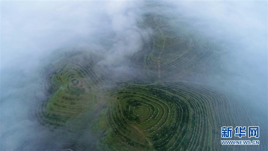 云霧繚繞的寧夏彭陽(yáng)縣金雞坪梯田公園(7月17日攝)。新華社記者 王鵬 攝