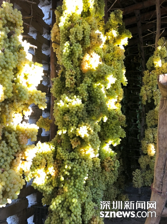 鏤空的土磚房具有良好的通透性,把葡萄搭在干樹枝上一層層碼起來高達(dá)屋頂,慢慢就會(huì)失去水分自然晾成葡萄干了。趙春麗攝