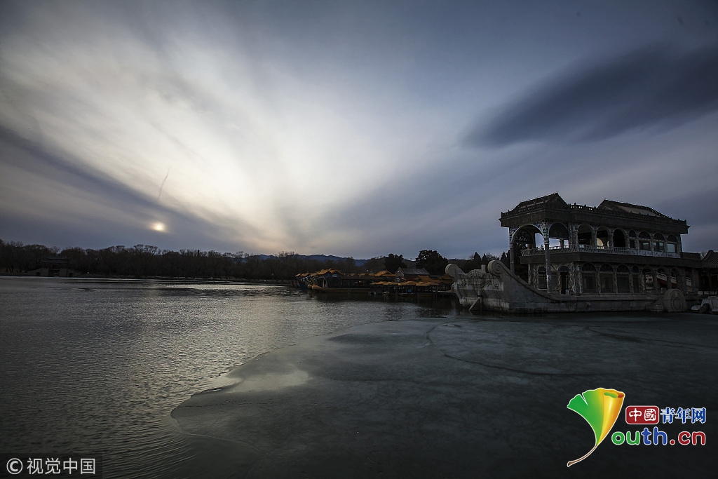 2018年2月23日,北京頤和園。當(dāng)天日落時(shí)分昆明湖上空出現(xiàn)夕陽余暉的美景,夢幻般的色彩將古老的皇家園林裝扮得美輪美奐,讓人流連忘返。