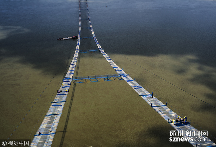 2018年5月14日,武漢,武漢楊泗港長(zhǎng)江大橋上空,上部結(jié)構(gòu)施工進(jìn)入貓道面網(wǎng)鋪設(shè)階段,數(shù)十名中鐵大橋局工人在跨江高空拼搏趕超,江面上空的臨時(shí)“吊橋”悄然形成。數(shù)十名工人在長(zhǎng)江上空228米處拼搏趕超,臨時(shí)“天梯”悄然形成。